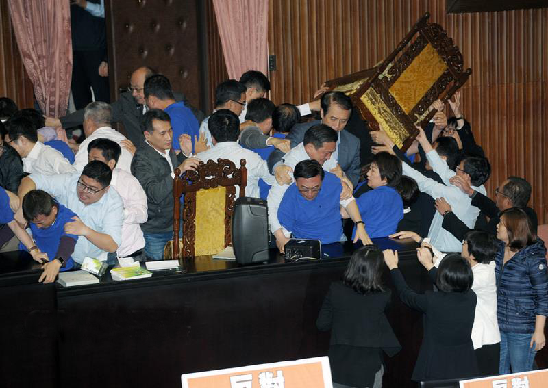 民進黨“立委”沖上主席臺,與國民黨“立委”爆發(fā)嚴(yán)重肢體沖突。(圖片來源:臺灣“中央社”)