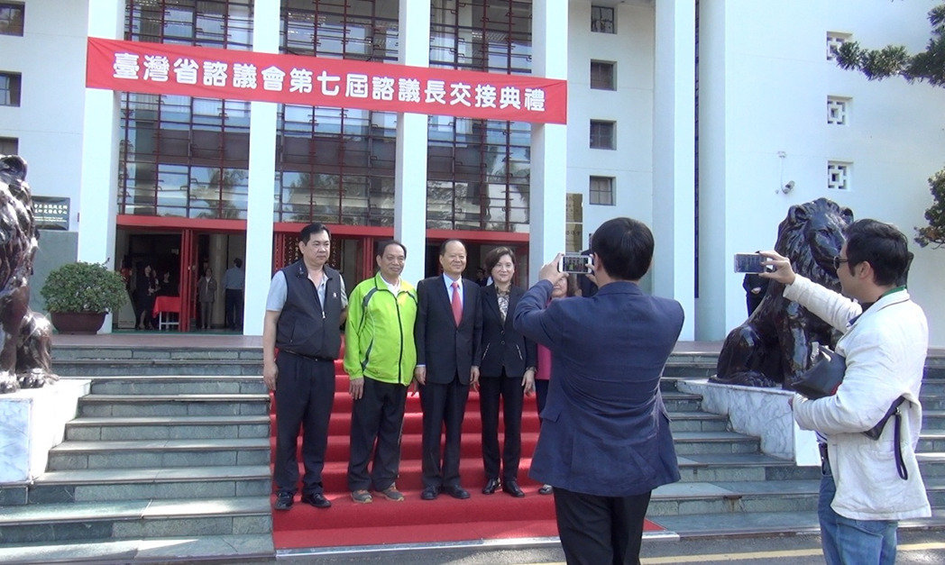 臺(tái)灣省咨議會(huì)咨議長(zhǎng)鄭永金(左三)今天接任,但臺(tái)“行政院”未同時(shí)派任其他咨議員,讓臺(tái)灣省咨議會(huì)的未來(lái)定位值得觀察。(圖片來(lái)源:臺(tái)灣《聯(lián)合報(bào)》)