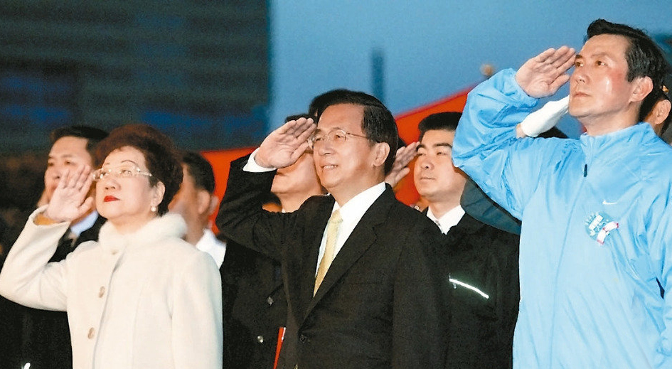 當(dāng)年,陳水扁擔(dān)任臺灣地區(qū)領(lǐng)導(dǎo)人期間,馬英九曾以中國國民黨主席身份出席元旦升旗活動,與陳水扁、呂秀蓮并肩而立。(圖片來源:臺灣《聯(lián)合報》)