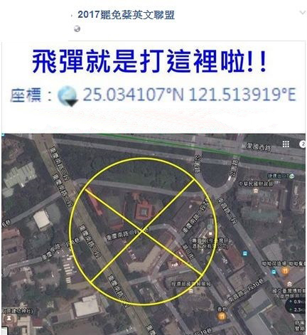 中國臺灣網(wǎng)1月4日訊 臺灣網(wǎng)友在Facebook成立“2017罷免蔡英文聯(lián)盟”社團(tuán),日前卻有人以谷歌地圖清楚標(biāo)示臺灣地區(qū)領(lǐng)導(dǎo)人蔡英文官邸坐標(biāo),并向大陸解放軍喊話:“飛彈(導(dǎo)彈)就是打這里(官。├玻 ,在島內(nèi)引發(fā)爭議。對此,蔡英文辦公室于3日晚間作出回應(yīng)。