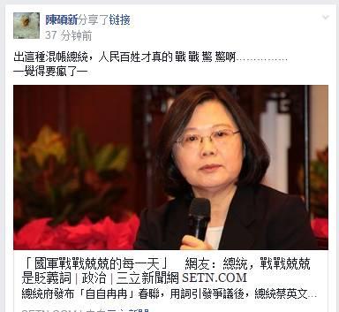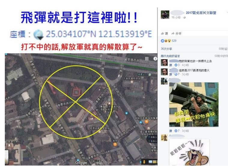 1月2日晚,名為莊士弘的臺灣網(wǎng)友在Facebook上轉發(fā)了一張“總統(tǒng)府”的衛(wèi)星地圖,圖片上專門用黃色標記圈起位置,并“貼心”地附上詳細坐標,還給解放軍撂下這樣兩句話:“飛彈就是要打這里啦!打不中的話,解放軍真的解散算了!”。