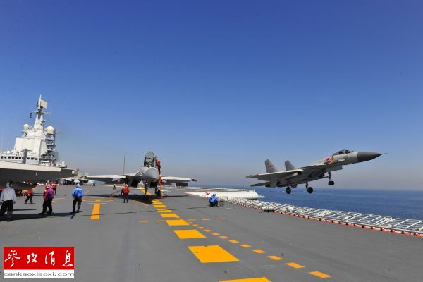 殲-15艦載戰(zhàn)斗機在遼寧艦上進行起降訓練。 新華社發(fā)(張凱 攝)