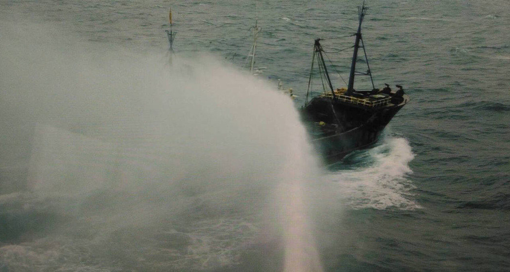 大陸漁船被臺(tái)灣軍艦以強(qiáng)力水炮進(jìn)行“驅(qū)離”。(圖片來(lái)源:臺(tái)灣《聯(lián)合報(bào)》)