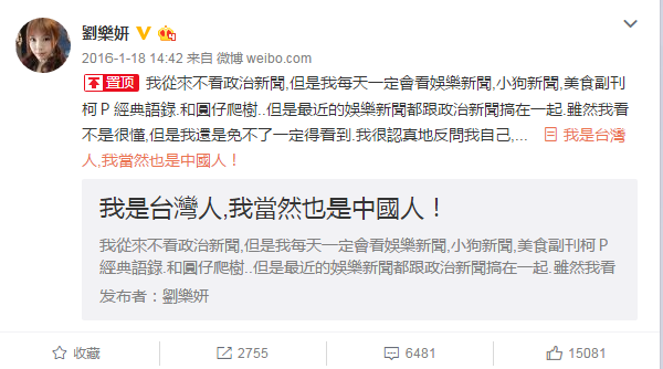 參考消息網(wǎng)1月17日報道(文/陳娟 亞君)因為力挺大陸航母遼寧艦駛?cè)肱_灣海峽,臺灣女星劉樂妍徹底紅了。