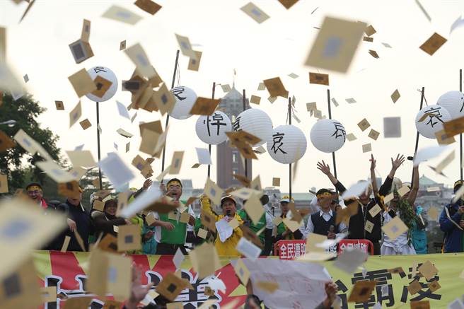 臺(tái)灣“軍公教勞”團(tuán)體舉著白燈籠撒紙錢(qián),為蔡英文當(dāng)局“送終”。(圖片來(lái)源:臺(tái)灣《聯(lián)合報(bào)》)