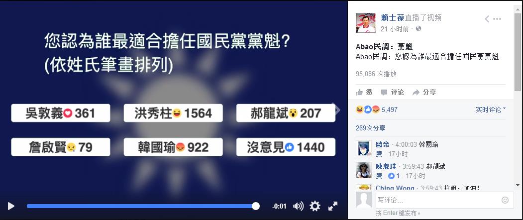 賴士葆此次發(fā)起名為“您認為誰最適合擔任國民黨黨魁”的民意調(diào)查,用“點贊”的方式讓網(wǎng)友表達支持誰。截止到8日中午12點,洪秀柱以1855票大幅領(lǐng)先,第2名為韓國瑜1051票,第3名為吳敦義423票, 之后為郝龍斌240票,詹啟賢以98票墊底。