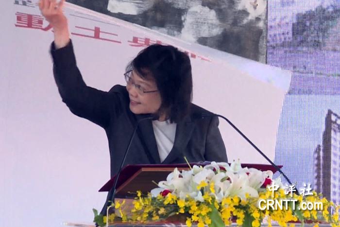 蔡英文2016年12月19日在桃園主持社會住宅開工典禮,瞬間大風,把背后廣告牌吹落,軟板砸到蔡英文的頭,被諷“舉頭三尺有神明”。(圖片來源:中評社)