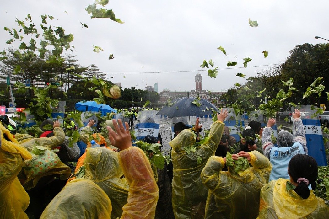 抗議群眾向向蔡辦投擲一堆“爛菜”,表達(dá)心中怒火。(圖片來源:臺灣《聯(lián)合報》)