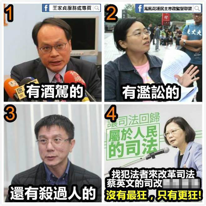 據(jù)報(bào)道,“鳳凰花護(hù)民主市政監(jiān)督聯(lián)盟”Facebook粉絲頁(yè)特為此事整理制作出圖表,上寫:找犯法者來(lái)改革司法,蔡英文的司改會(huì)議沒(méi)有最狂,只有更狂!圖表中直接在“時(shí)代力量”創(chuàng)黨大將林峯正照片上標(biāo)記“有酒駕的”;在中正大學(xué)法律系教授盧映潔照片上標(biāo)記“有濫訟的”;在昔日知名財(cái)經(jīng)律師劉北元照片上標(biāo)記“還有殺過(guò)人的”。