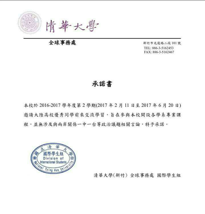 臺灣新竹清華大學(xué)與大陸高校簽訂的“一中承諾書”曝光