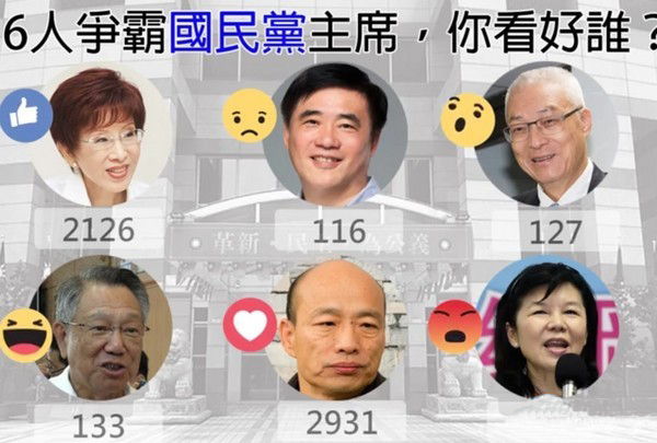 面對(duì)國(guó)民黨主席選舉“6人爭(zhēng)霸”激烈態(tài)勢(shì),島內(nèi)網(wǎng)絡(luò)媒體利用Facebook“心情投票”方式,調(diào)查選舉人支持度情況。(圖片來(lái)源:“東森新聞云”)