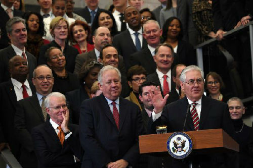 資料圖片:美國務(wù)卿雷克斯·蒂勒森(前右) 新華社記者殷博古攝