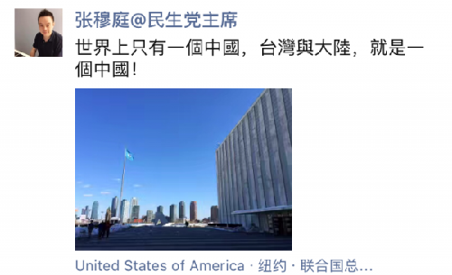 從3月12日開(kāi)始,參考消息網(wǎng)-銳參考一直在與張穆庭保持著聯(lián)絡(luò),也發(fā)現(xiàn)這位38歲的臺(tái)灣年輕人在各種場(chǎng)合,宣揚(yáng)他的理念和立場(chǎng)。如3月17日上午,路過(guò)紐約的聯(lián)合國(guó)總部大樓時(shí),他抬手拍下一張照片發(fā)到朋友圈,配文道:世界上只有一個(gè)中國(guó),臺(tái)灣與大陸,就是一個(gè)中國(guó)!