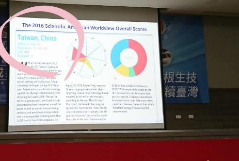 臺(tái)灣“生技醫(yī)藥國(guó)家型計(jì)劃”成果發(fā)表會(huì)22日在“臺(tái)大醫(yī)院國(guó)際會(huì)議中心”召開(kāi)。在計(jì)劃總主持人楊泮池介紹成果的簡(jiǎn)報(bào)上,出現(xiàn)了“Taiwan,China”。這被“綠委”林靜儀發(fā)現(xiàn),并將簡(jiǎn)報(bào)畫(huà)面上傳到其臉譜上,表示,“蛤?我看到什么?楊泮池校長(zhǎng),你準(zhǔn)備簡(jiǎn)報(bào)時(shí)覺(jué)得沒(méi)問(wèn)題嗎?”