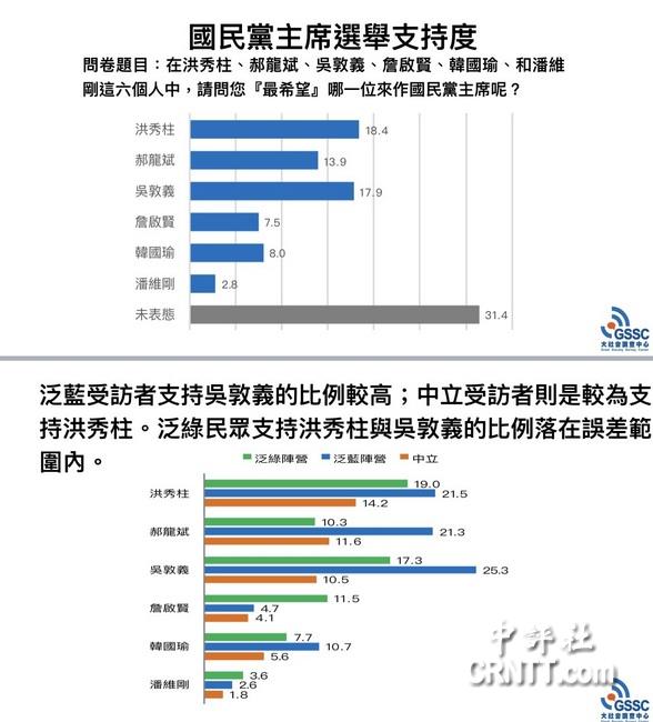 即將于2017年5月20日舉行的國民黨主席是由合格黨員投票,因此,全民調(diào)僅具參考價值。不過,該民調(diào)結(jié)果顯示,泛藍(lán)受訪者支持吳敦義比例較高,中立支持者較支持洪秀柱,泛綠民眾支持洪秀柱與吳敦義落在誤差范圍內(nèi),間接顯示吳占優(yōu)勢。
