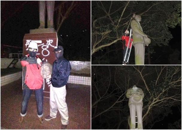 “臺(tái)獨(dú)”團(tuán)體“臺(tái)灣建國(guó)工程隊(duì)”因不滿臺(tái)北市長(zhǎng)柯文哲早前在馬來(lái)西亞演講時(shí),表示反對(duì)目前的“去蔣化”行動(dòng),遂于3日凌晨再次發(fā)起“斬首蔣介石行動(dòng)”,把位于臺(tái)北信義區(qū)福德街、柯文哲辦公室附近一個(gè)蔣介石銅像的頭斬下來(lái),以表達(dá)對(duì)柯文哲的不滿。