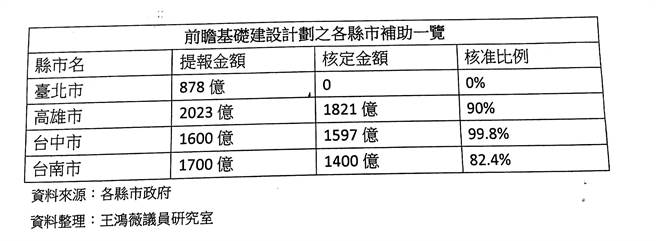 王鴻薇指出,前瞻計(jì)劃補(bǔ)助嚴(yán)重不均,高雄提供2023億元,“政院”核定1821億元,比例達(dá)九成;臺(tái)中提報(bào)的1600億元只小刪3億元,幾乎全數(shù)通過(guò)。臺(tái)北卻因柯市府事前爭(zhēng)取不力、事后裝聾作啞,9項(xiàng)提案全被打槍?zhuān)虚L(zhǎng)施政報(bào)告中一字不提,她要嚴(yán)重抗議。