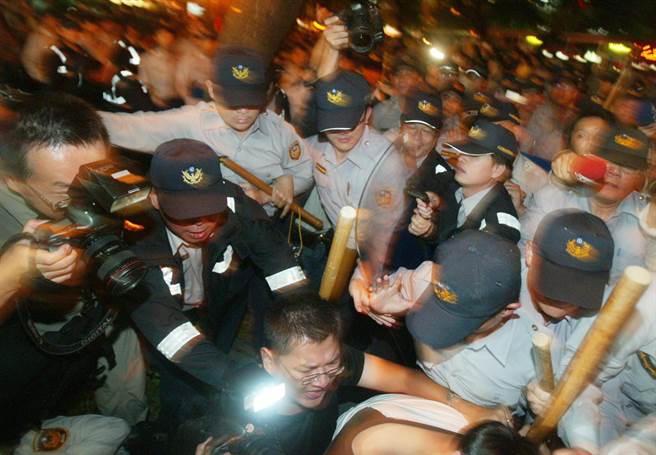 2008年,國民黨榮譽(yù)主席連戰(zhàn)宴請時(shí)任海協(xié)會長陳云林,民進(jìn)黨在飯店外煽動(dòng)沖突,許多警察、采訪記者與民眾紛紛倒地。(臺灣“中時(shí)”報(bào)系資料圖)
