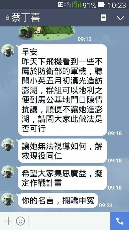 據(jù)報道,蔡丁喜2年前從“澎防部”副參謀長職位退伍,疑因不滿民進(jìn)黨當(dāng)局年金改革,于澎湖“漢光演習(xí)”前夕,在臉書上向全臺公務(wù)人員協(xié)會理事長李來希表示,蔡英文在5月初將抵澎湖巡視“漢光演習(xí)”成果,可以借此機(jī)會號召群眾,在馬公基地門口“攔轎申冤”,讓蔡英文無法視導(dǎo),并“解救現(xiàn)役同袍”。