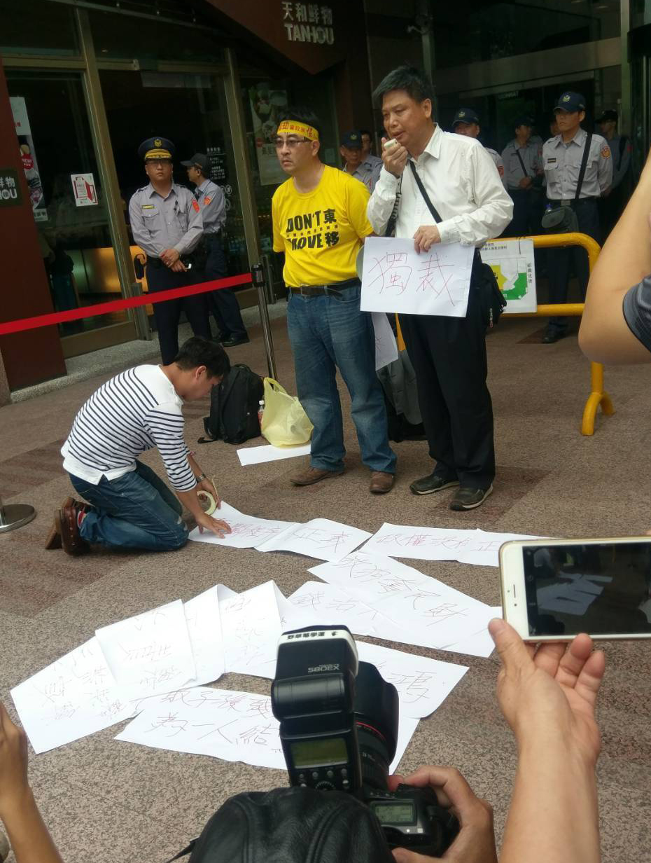 島內(nèi)政治大學教授徐世榮赴民進黨中央黨部抗議。(圖片來源:臺灣《聯(lián)合報》)