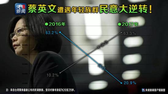 。ㄑ胍曅侣効蛻舳耍┡_(tái)灣當(dāng)局領(lǐng)導(dǎo)人上臺(tái)近一周年,多項(xiàng)民調(diào)顯示,蔡英文的支持率大幅下滑,不滿意度陡增。臺(tái)灣媒體特別關(guān)注到,去年力挺蔡英文的20至29歲年輕族群一周年之間發(fā)生大逆轉(zhuǎn),成為對(duì)蔡最為不滿的人群。媒體稱“這對(duì)認(rèn)為自己最理解年輕人的蔡英文而言,無疑是重大警訊”。