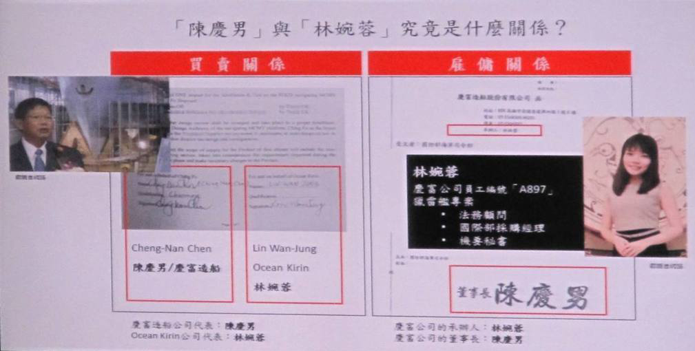 馬文君直接出示慶富與OCEAN KIRIN簽約的負責人簽名文件,質(zhì)疑該交易疑點重重。(臺媒圖)