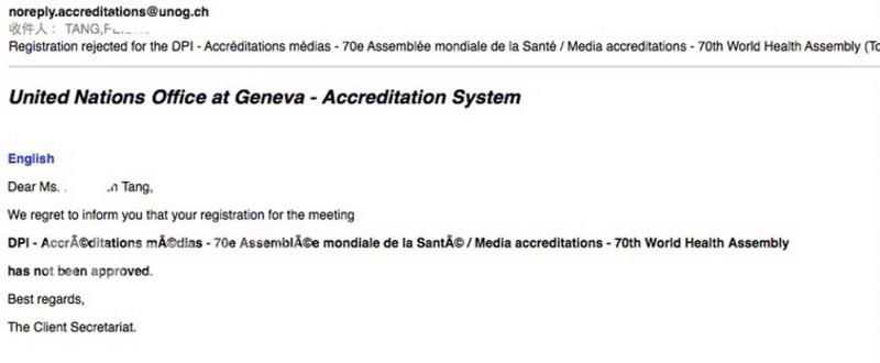 聯(lián)合國(guó)歐洲總部以電郵通知臺(tái)灣某官方媒體記者,拒絕核發(fā)WHA采訪證