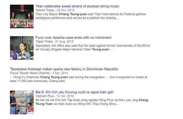 而且耿直哥可是通過搜索引擎搜索了半天呢。比如,當(dāng)我把那位臺灣宜蘭市民進黨的市長江聰淵的英文名字“Chiang Tsung-Yuan”輸入后,搜索引擎給出的結(jié)果只有區(qū)區(qū)四個,而且最新的一個還是2016年的…