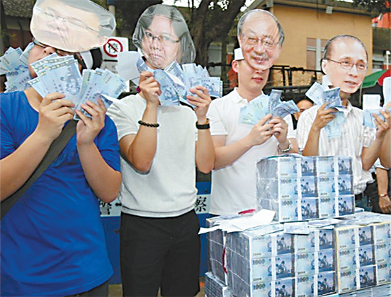 13日,上千民眾在臺(tái)北示威要求蔡英文下臺(tái)。圖為示威者戴著蔡英文等人的面具諷刺臺(tái)當(dāng)局亂撒錢(qián)。
