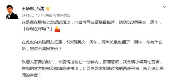 原來,這是臺灣新黨青年委員會委員王炳忠5月15日自己的微博和臉書同步發(fā)起了一項名為“你現(xiàn)在好嗎?”的視頻自拍征集活動,他“向臺灣網(wǎng)友征集自拍片,談?wù)?20蔡英文一周年!