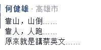 有臺灣網(wǎng)友表示,“民進(jìn)黨不倒,臺灣不會好!靠你?靠妖啦!”、“蔡明明就是砍殺軍人的頭號殺手,居然說是最大靠山,臉都不會紅嗎?”還有網(wǎng)友諷刺,“靠山,山倒……”、“笑到今晚都睡不著了”。(綜編/海外網(wǎng) 李萌)