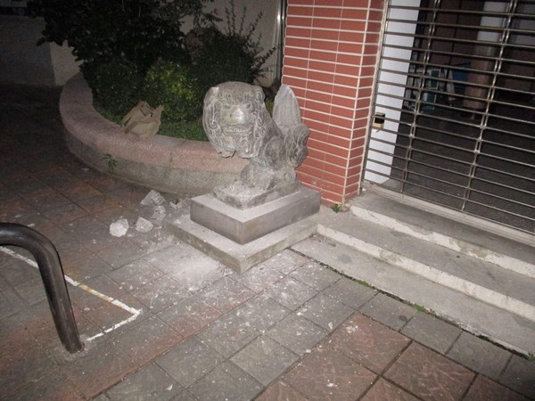 臺北市北投區(qū)逸仙小學(xué)校門前擺放的兩尊超過60年的“石狛犬”,28日晚被前臺北市議員李承龍和同伴邱晉芛持榔頭砸毀。(圖片來源:臺灣“東森新聞云”)