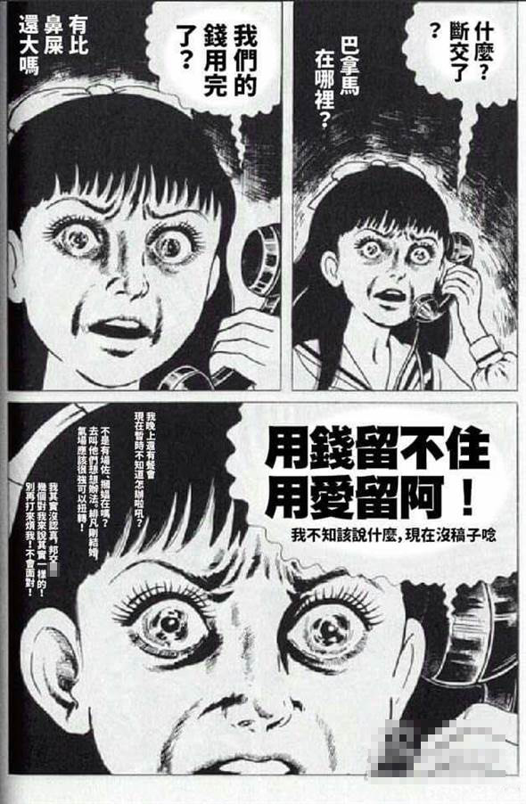 這則三格漫畫改編自日本漫畫家楳圖一雄的恐怖漫畫《漂流教室》,畫中女主角拿著電話筒,表情驚恐地說:“什么?‘斷交’了?”、“我們的錢用完了?”、“用錢留不住,用愛流。。ㄎ也恢撜f什么,現在沒稿子念)”。