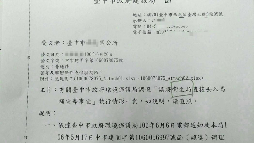 這份公文由臺中市建設局發(fā)出,起因是臺中市環(huán)保局調查情況,建設局轉發(fā)給各區(qū)公所匯整意見,沒想到把“衛(wèi)生紙”寫成“衛(wèi)生局”,原本嚴肅的公文書變成網絡熱傳的搞笑文。