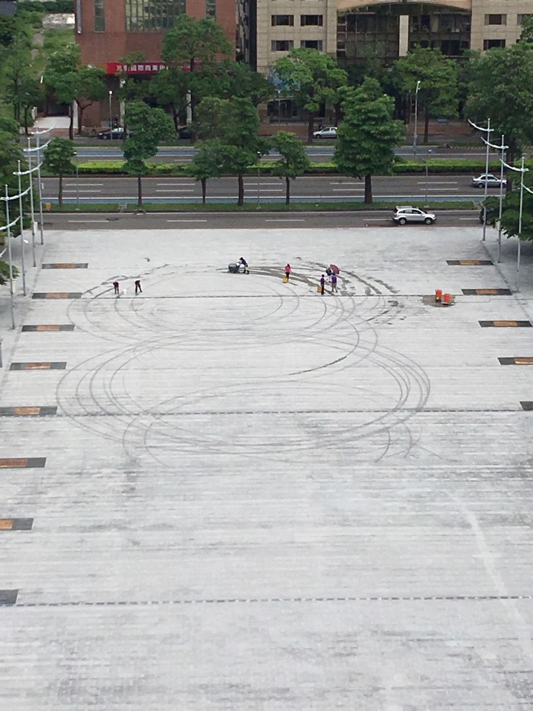今天接近中午時,臺中市政府廣場有民眾把車開上市府廣場練“甩尾”,發(fā)出巨大聲響,廣場留下好幾圈胎痕,市府馬上派人清理。