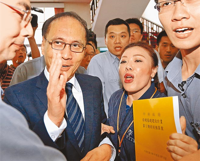 臺(tái)灣“立院”13日下午召開臨時(shí)會(huì),臺(tái)當(dāng)局“行政院長(zhǎng)”抵“立院”時(shí)從側(cè)門進(jìn)議場(chǎng),但還是被國(guó)民黨“立院”黨團(tuán)副書記長(zhǎng)李彥秀(右二)拿著預(yù)算書表達(dá)抗議。國(guó)民黨女力表現(xiàn)強(qiáng)悍,成議場(chǎng)內(nèi)最吸睛的一群。(圖片來(lái)源:臺(tái)灣《中國(guó)時(shí)報(bào)》)
