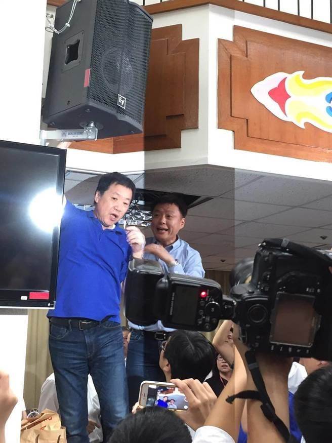 “藍(lán)委”費(fèi)鴻泰(左)爬高破壞喇叭,“綠委”趙天麟(右)上前制止。(圖片來(lái)源:臺(tái)灣“中時(shí)電子報(bào)”)