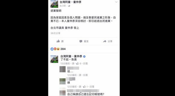 童仲彥曾是民進(jìn)黨臺北市議員,因?yàn)榧冶、外遇風(fēng)波鬧得沸沸揚(yáng)揚(yáng)后宣布退出民進(jìn)黨,但疑似忘記切換帳號,自己留言“了不起,負(fù)責(zé)”,淪為各界笑柄。