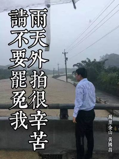 今年6月臺灣北部淹水,“時(shí)代力量立委”黃國昌回新北選區(qū)勘災(zāi)。照片中,一旁的人撐著傘或穿雨衣,僅他一人濕身一片,但遭到大批網(wǎng)友諷刺上演“濕背秀”。網(wǎng)友惡搞改圖狠酸黃國昌是“立法院最佳演員”、“雨天外拍很辛苦,請不要罷免我”、“難道濕身比較帥?”、“時(shí)力買不起雨衣?”等。