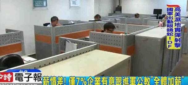 中國(guó)臺(tái)灣網(wǎng)9月25日訊 據(jù)臺(tái)灣“中時(shí)電子報(bào)”報(bào)道,臺(tái)灣軍公教明年加薪3%,同時(shí)也希望能帶動(dòng)臺(tái)灣地區(qū)企業(yè)跟進(jìn)。根據(jù)臺(tái)灣人力銀行調(diào)查發(fā)現(xiàn),有意愿在今年第四季幫員工加薪的企業(yè)只有7%,有五成上班族表示,有超過(guò)3年沒(méi)加薪。