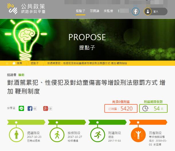 中國臺灣網(wǎng)11月3日訊 據(jù)臺灣《中時(shí)電子報(bào)》報(bào)道,近年來,臺灣的性侵事件防不勝防,有網(wǎng)友在上月23日針對性侵、酒駕及幼童傷害,擬增設(shè)“鞭刑制度”,并在“公共政策網(wǎng)絡(luò)參與平臺”提案,目前已有5000人附議通過,相關(guān)機(jī)構(gòu)須在明年1月3日前響應(yīng)。