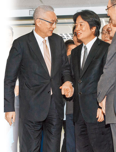 臺當(dāng)局“行政院長”賴清德(右)3日拜會國民黨主席吳敦義(左),兩人在吳敦義辦公室外笑容滿面握手致意,隨后兩人手牽手步入會議室。(圖片來源:臺灣《中時電子報》)