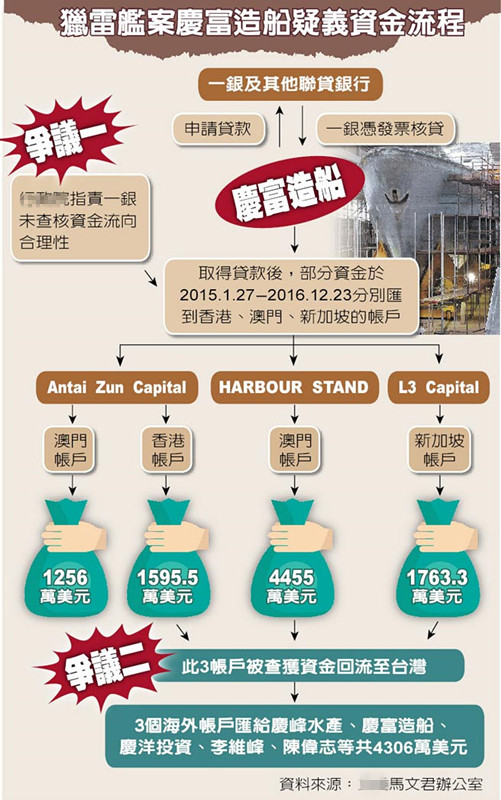 馬文君指出,慶富往Antai Zun Capital香港賬戶匯了1595.5萬(wàn)美元、HARBOUR STAND澳門賬戶有4455萬(wàn)美元、L3 Capital新加坡賬戶有1763.3萬(wàn)美元,這三筆賬戶有資金回流到臺(tái)灣,匯往慶峰水產(chǎn)、慶富造船、慶洋投資,以及慶富相關(guān)人士利瓦伊峰以及陳偉志的戶頭,共4306萬(wàn)美元,約13億新臺(tái)幣。