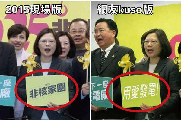 民進(jìn)黨昔日打著“非核家園”的反核旗幟撈選票,也曾喊出“用愛發(fā)電”等口號,如今已幾乎成為兩岸民眾的笑柄。圖為島內(nèi)網(wǎng)友借此調(diào)侃蔡英文。(臺媒合成圖)