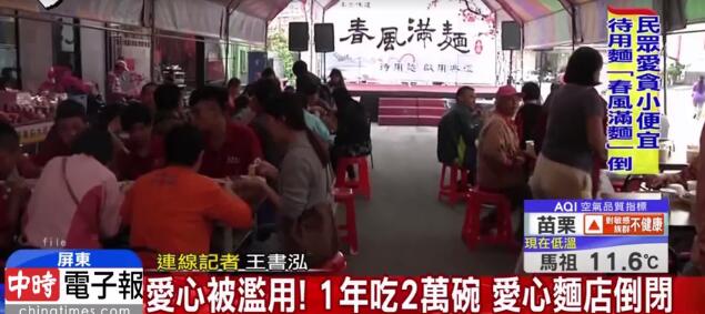 中國(guó)臺(tái)灣網(wǎng)12月26日訊 臺(tái)灣人愛(ài)貪小便宜嗎?才開(kāi)張一年的“愛(ài)心待用面”竟被吃倒了!據(jù)臺(tái)灣《中時(shí)電子報(bào)》報(bào)道,屏東市去年才開(kāi)張的面館“春風(fēng)滿(mǎn)面”,在發(fā)出近2萬(wàn)碗后,傳出遭民眾濫用資源而決定收攤的消息。地方人士惋惜,沒(méi)想到原預(yù)定撐2年的面館,提早1年就關(guān)門(mén)了。
