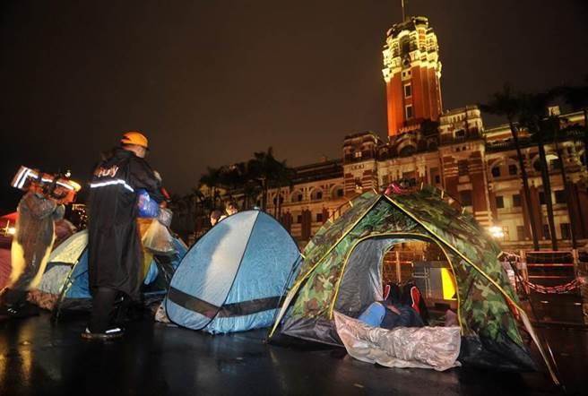 “時(shí)代力量”助理群在凱道上搭起數(shù)個(gè)小帳篷。(圖片來(lái)源:臺(tái)灣《中時(shí)電子報(bào)》)