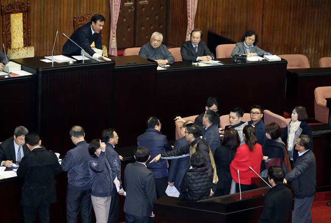 “立法院”9日臨時(shí)會(huì)處理“勞基法”部分條文修正草案,‘院長(zhǎng)'蘇嘉全(上)進(jìn)入議場(chǎng)后宣布進(jìn)入廣泛討論,遭國(guó)民黨團(tuán)上前抗議。(圖片來源:臺(tái)灣《中時(shí)電子報(bào)》)