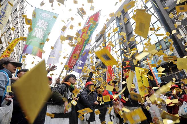 臺灣勞團(tuán)繞行“立法院”撒冥紙,表達(dá)不滿。(圖片來源:臺灣“中國時報(bào)”)