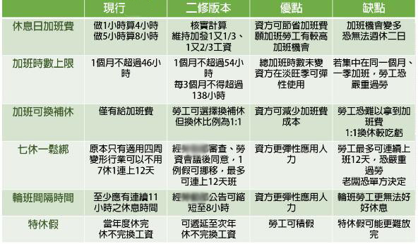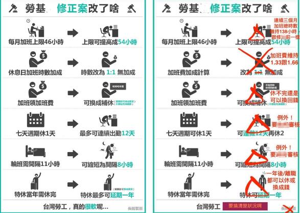 臺(tái)灣物理治療師林長(zhǎng)揚(yáng)近日整理了“勞基法”修正案中被修改的內(nèi)容,并制成圖表供網(wǎng)友閱覽,從現(xiàn)行規(guī)定到新修正案作出一系列的比較,列出了6大點(diǎn),并提出雖然部分規(guī)定都強(qiáng)調(diào)可以“勞資協(xié)商”,“但你我都知道,臺(tái)灣大部分的勞資協(xié)商都是……臺(tái)灣勞工,真的很軟呢!期待‘勞動(dòng)部’進(jìn)一步函釋,與落實(shí)勞檢!”