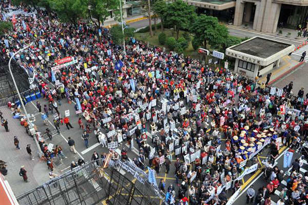 臺灣“立法院”臨時會,民進黨挾人數(shù)優(yōu)勢,表決通過修正“農(nóng)田水利會組織通則”。圖為反對改制的各地水利會成員們齊聚在“立法院”外抗議,痛批當(dāng)局霸占人民財產(chǎn)。(圖片來源:臺灣《中時電子報》)